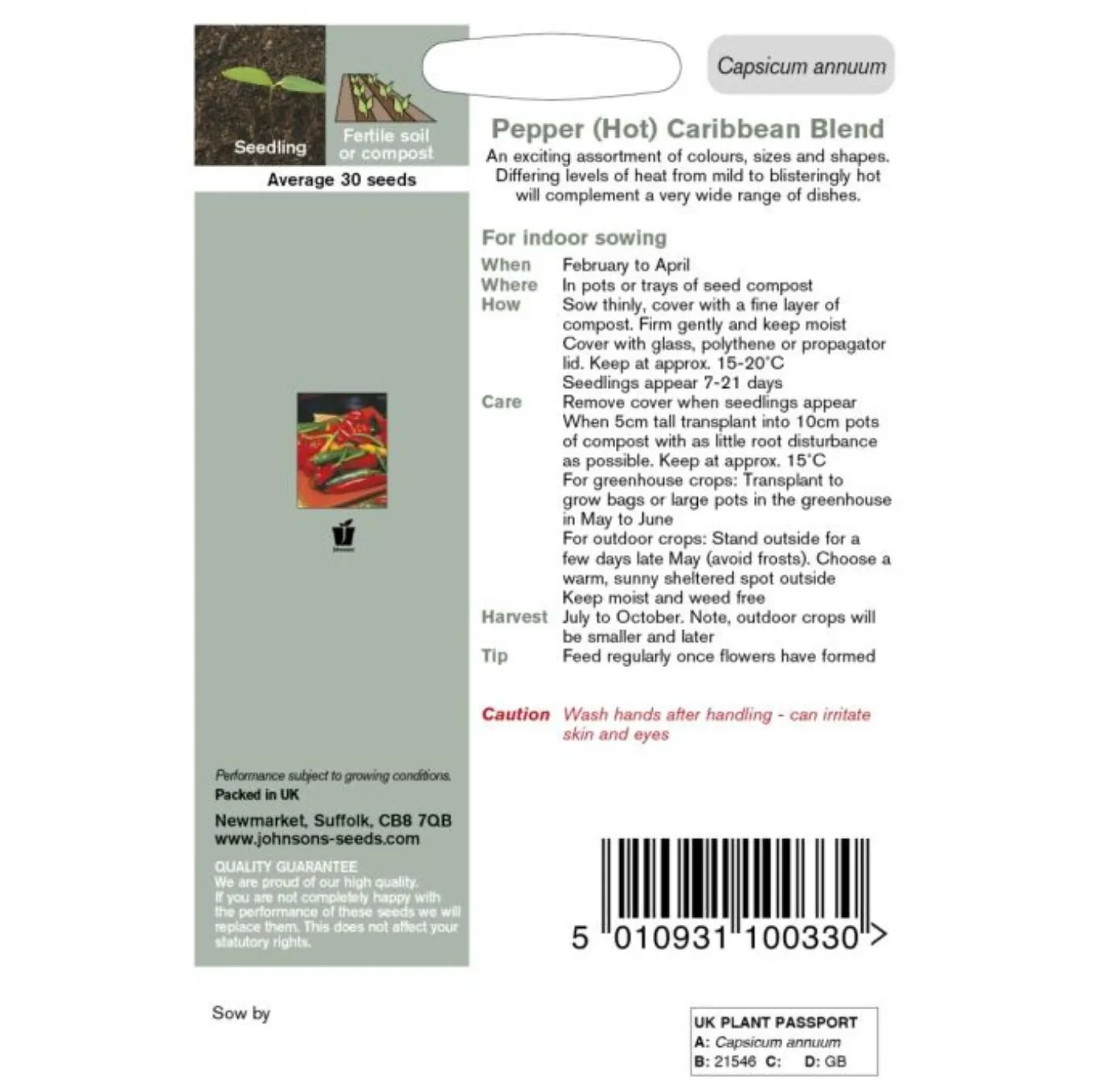 Så fröna i såjord eller kokosfiber ca 0,5–1 cm djupt. Håll jorden jämnt fuktig men inte blöt. Placera sådden varmt – 24–28 °C är idealiskt för groning. Groningstiden är 7–21 dagar, ibland längre, särskilt för chili.
