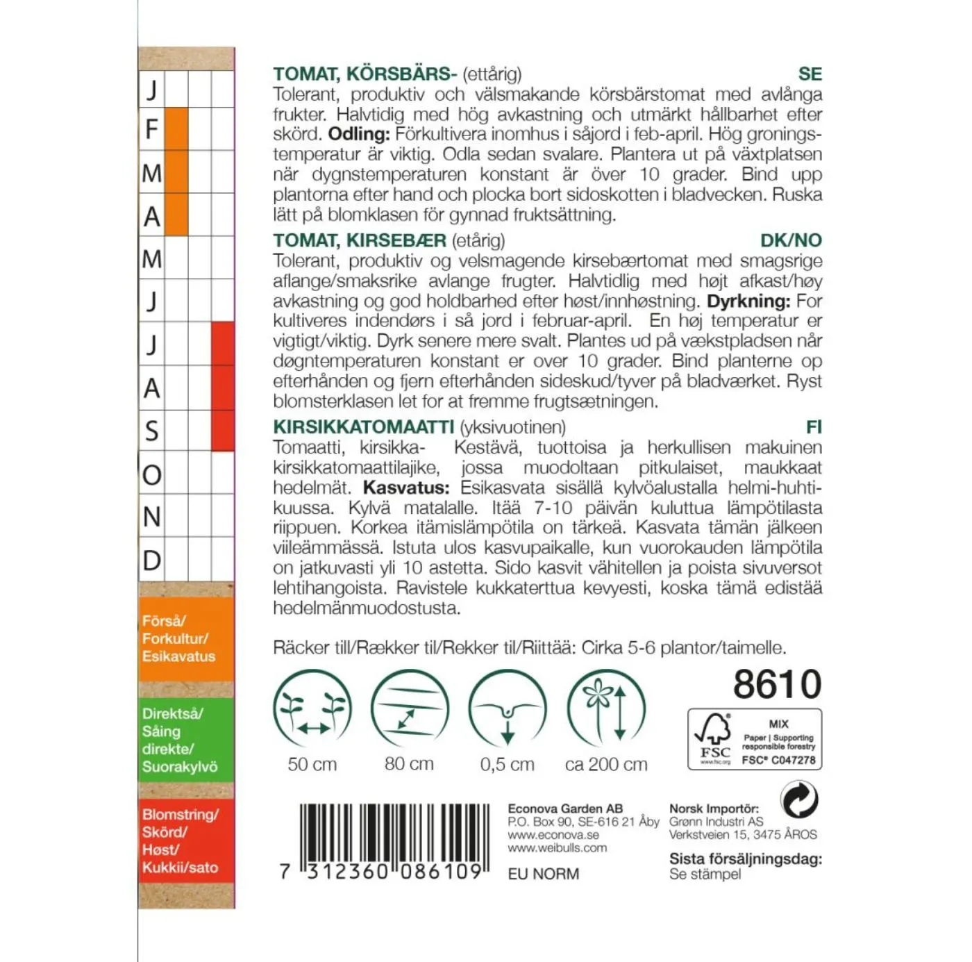 Määrä: 6 siementä'Monterrey' F1 on luomulaatuinen siemen, joka sopii luomuviljelyyn. Tomaateissa on runsaasti makua, ne ovat punaisia ja pitkulaisia, eivätkä halkeile helposti.