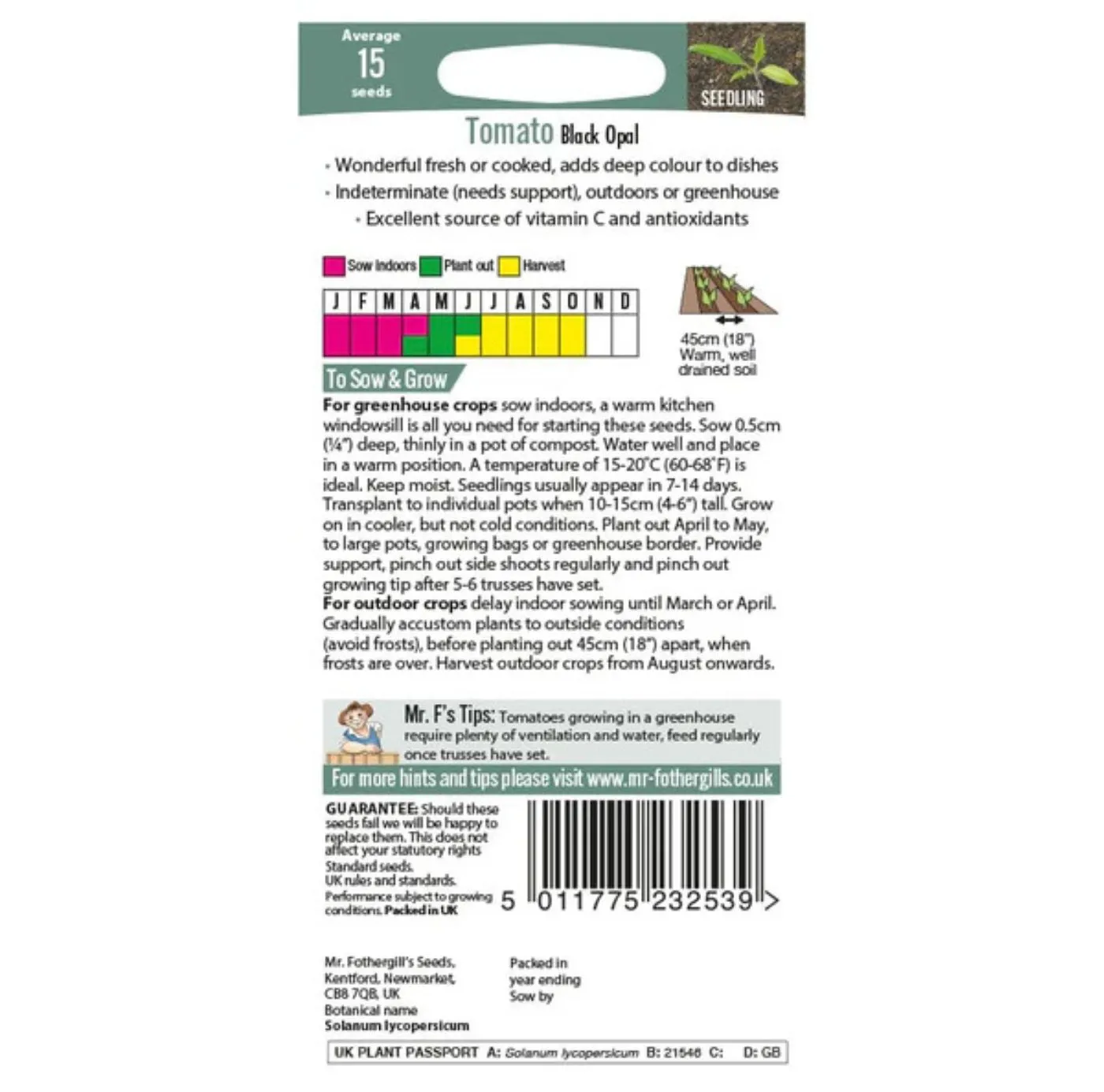 ‘Black Opal’ sisältää runsaasti C-vitamiinia ja antioksidantteja, ja sen tumma väri antaa upean sävyn ruokiin ja salaatteihin. Lajike on taudinkestävä ja kestää hyvin perunaruttoa, ja se sopii kasvatettavaksi kasvihuoneessa tai suojaisalla avomaalla. Runkotomaatti, joka tarvitsee tuennan.