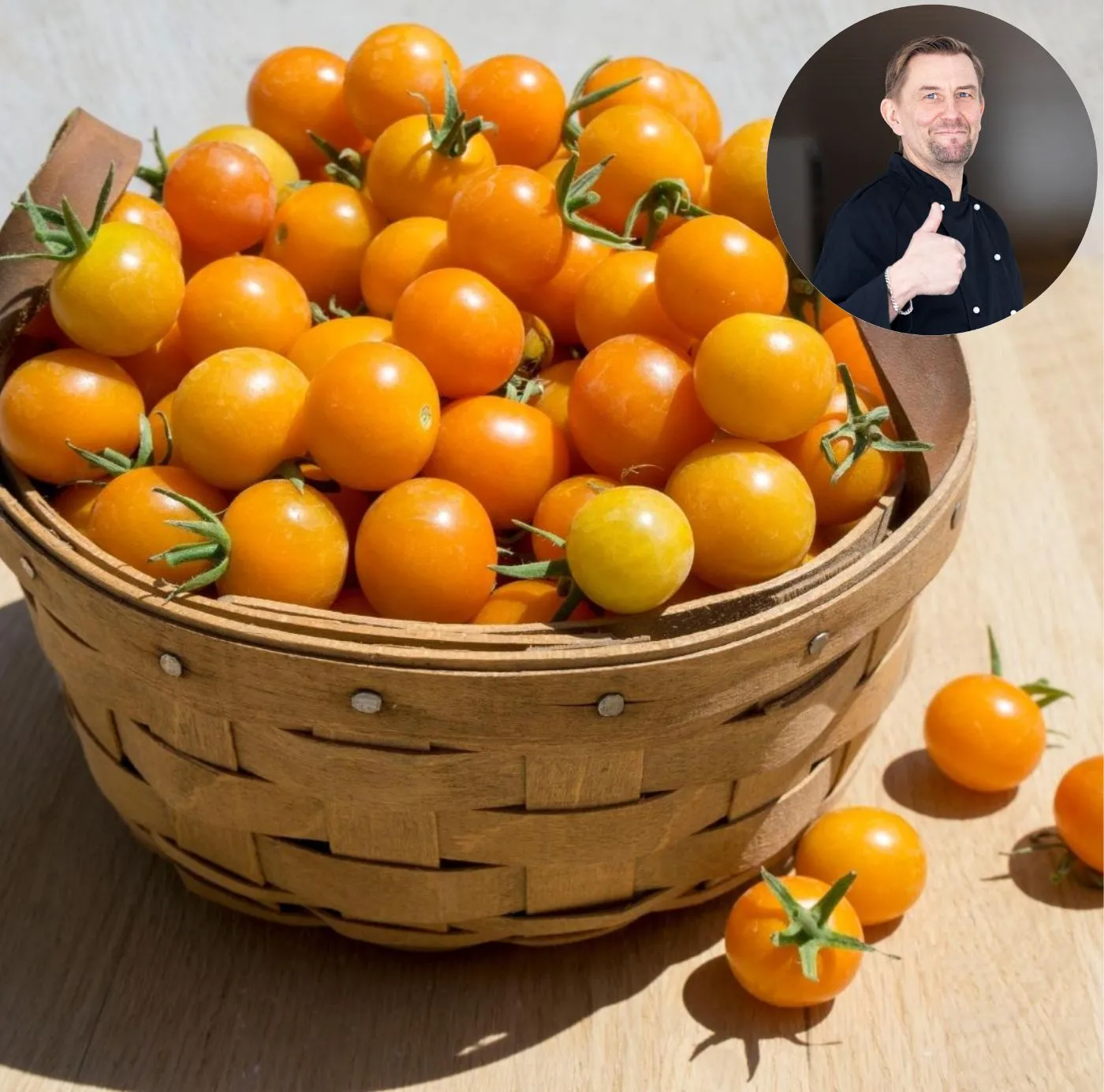 Tidigt och rikgivande, passar för växthus samt varma och skyddade platser ute. Frukterna är perfekta att äta direkt, i sallader eller som dekor på maträtter. Det är inte konstigt att ‘Sungold’ år efter år är vår mest sålda tomat!