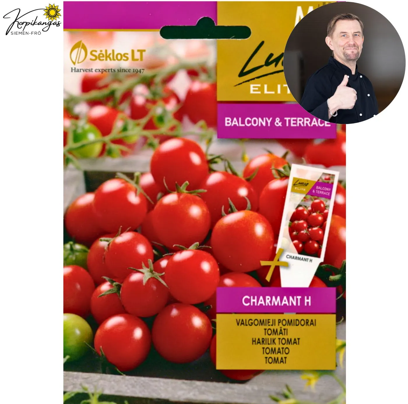 Körsbärstomat Charmant F1 är en uppskattad stamtomat, efterföljare till den populära Lupita-sorten. Det är en medeltidig hybrid som producerar långa klasar med röda, söta och smakrika frukter på 15–20 gram. Varje klase ger 20–40 tomater som mognar nästan samtidigt och kan plockas i klasar.
