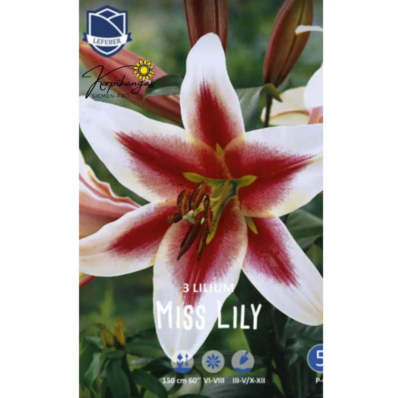 Lilium ‘Miss Lily’ on näyttävä ja voimakaskasvuinen puulilja, jonka suuret kukat hurmaavat tummanpunaisella keskuksellaan ja puhtaanvalkoisilla reunaterälehdillään. Värikontrasti tekee lajikkeesta erittäin elegantin ja katseenvangitsijan niin perennapenkissä kuin leikkokukkana.