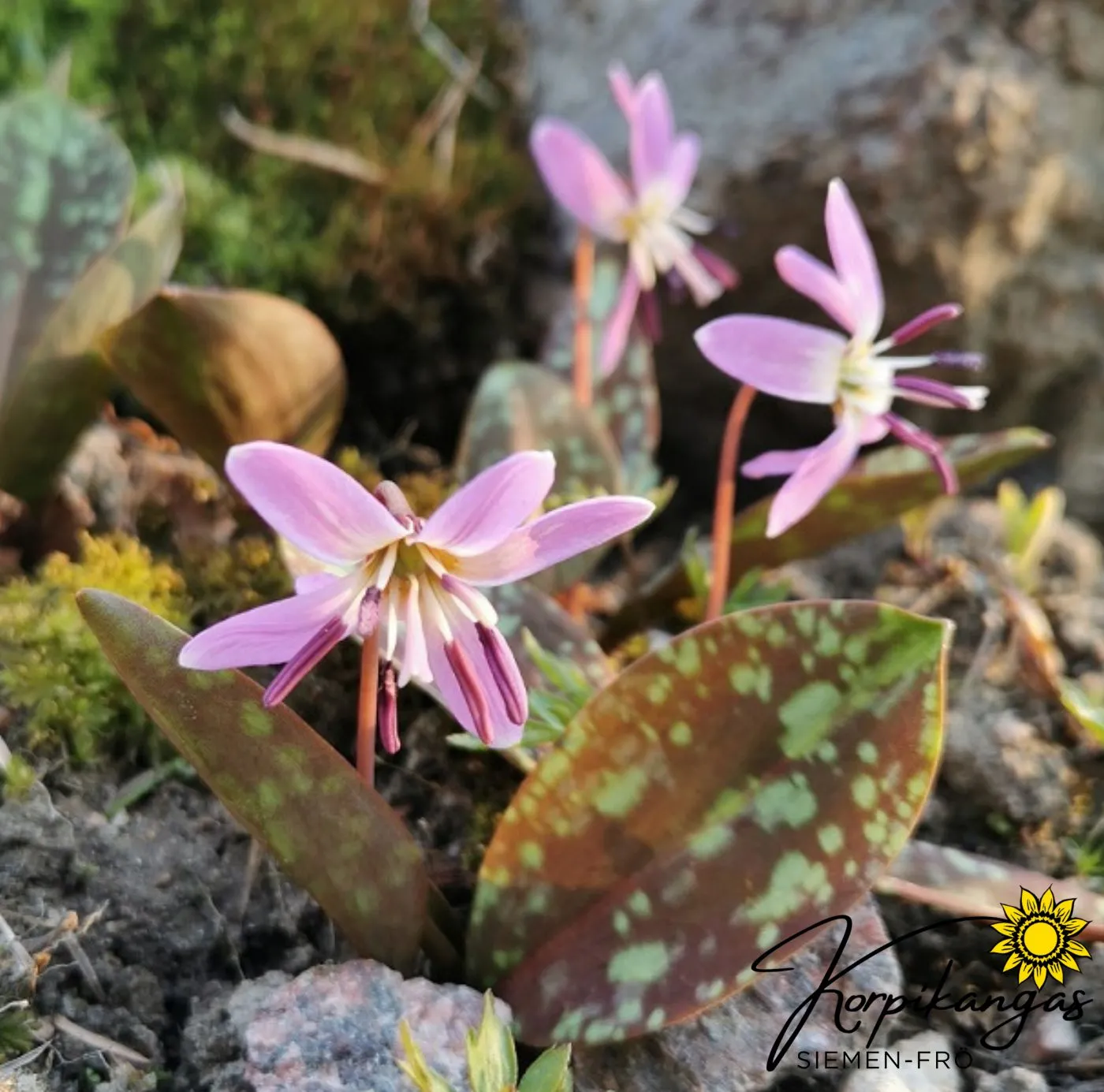 Erikoista: Hyvin kaunis ja sievä, aikainen kukkija, vaaleanpunaiset kukat, täplikkäät vihreät ja ruskeat lehdet, matala