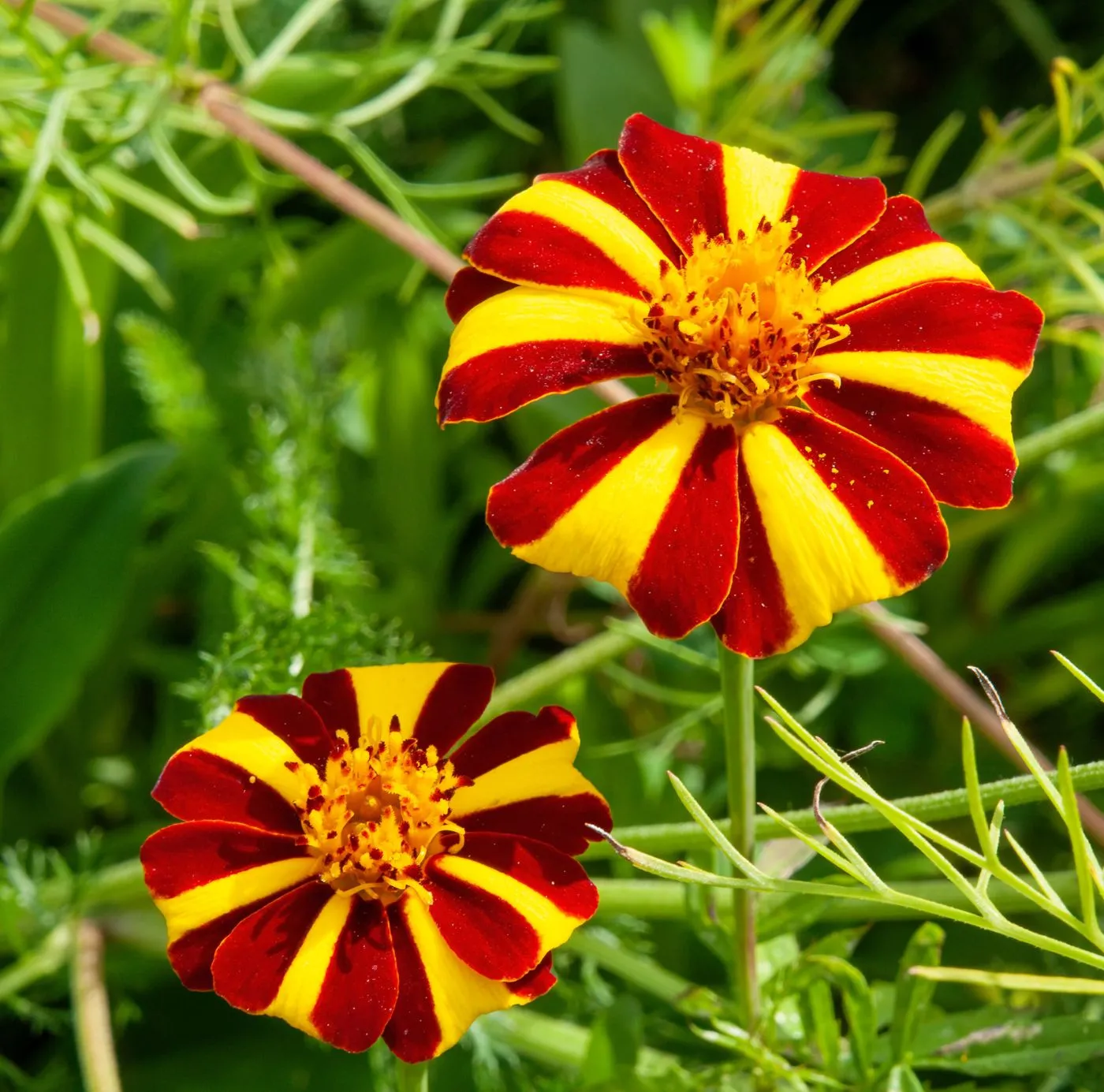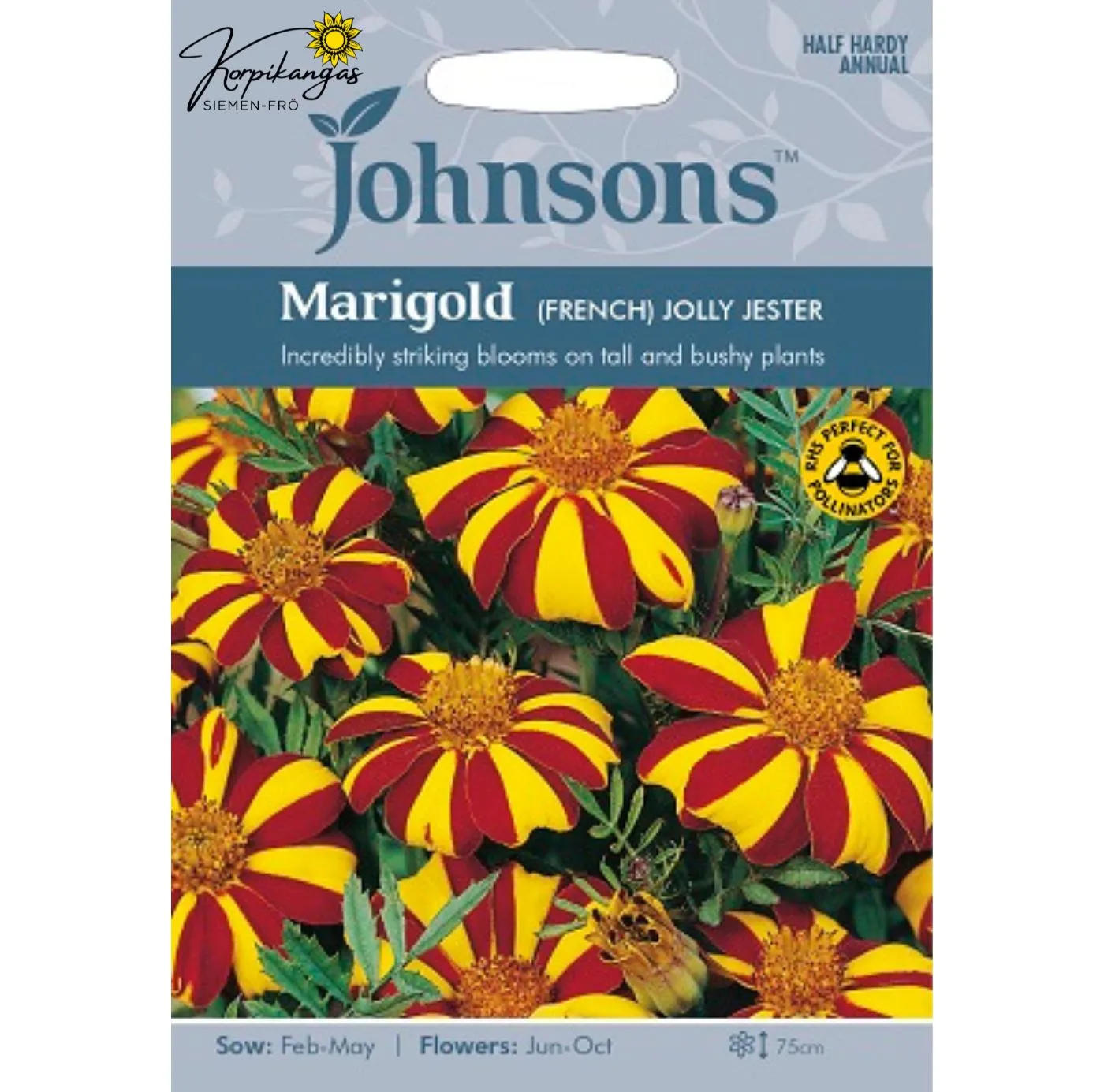 ‘Jolly Jester’ on näyttävä ja ilmeikäs samettikukka, jonka kaksiväriset kastanjanruskeat ja kullankeltaiset terälehdet tuovat puutarhaan iloista, vintage-henkistä sävyä. Runsaskukkainen, erinomaisen valinnan sekä kukkapenkkeihin että ruukkuistutuksiin. Helppo ja varma kasvattava koko kesän ajan.