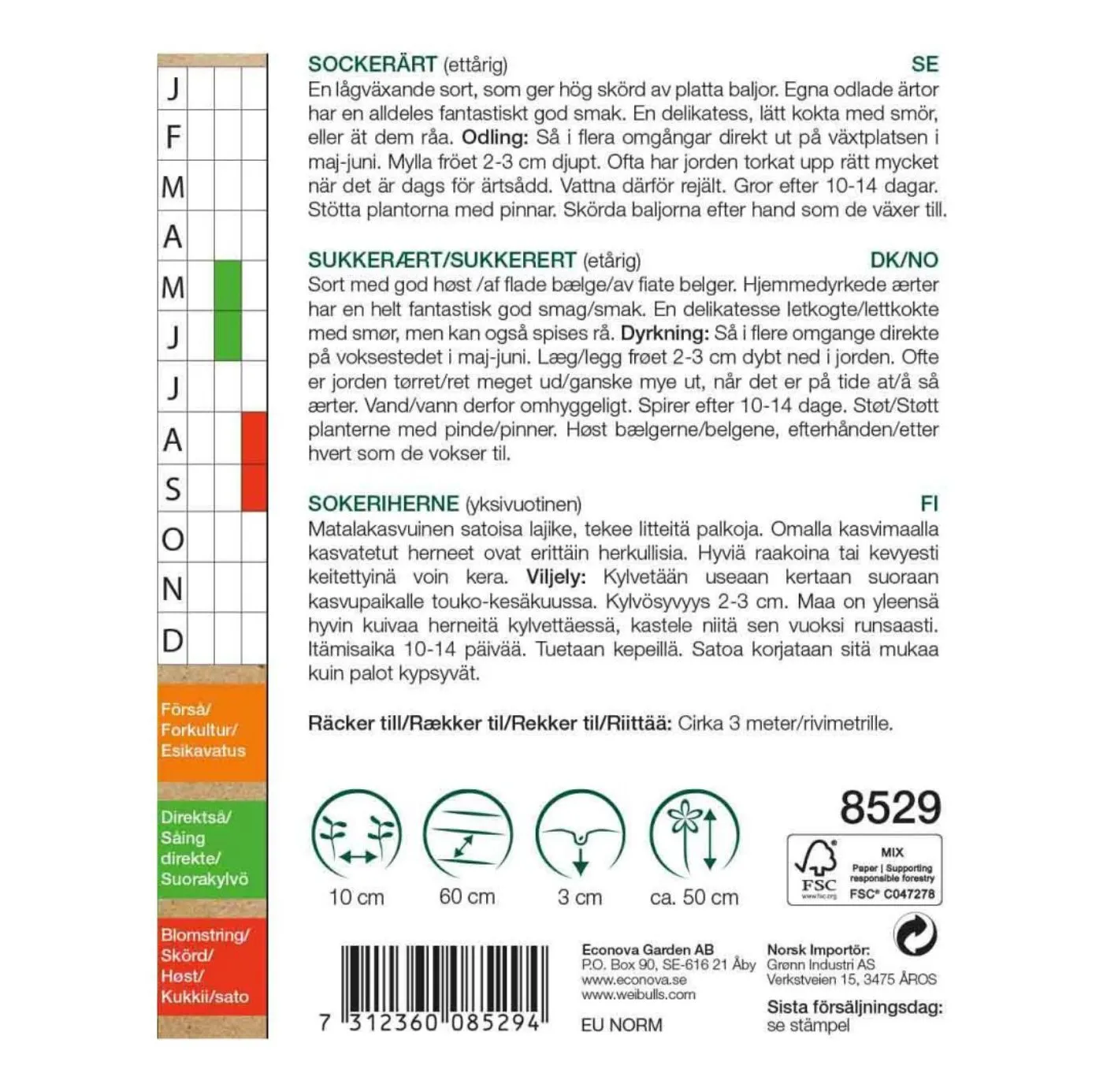 Matala ja nopea sokeriherne, maukkaat herneenpalot. Täydellinen kylvää aikaisin keväällä kasvihuoneessa aikaista satoa varten. Kasvaa vain 60 cm korkuiseksi, tarvitsee vain yksinkertaisen tuen pysyäkseen pystyssä.